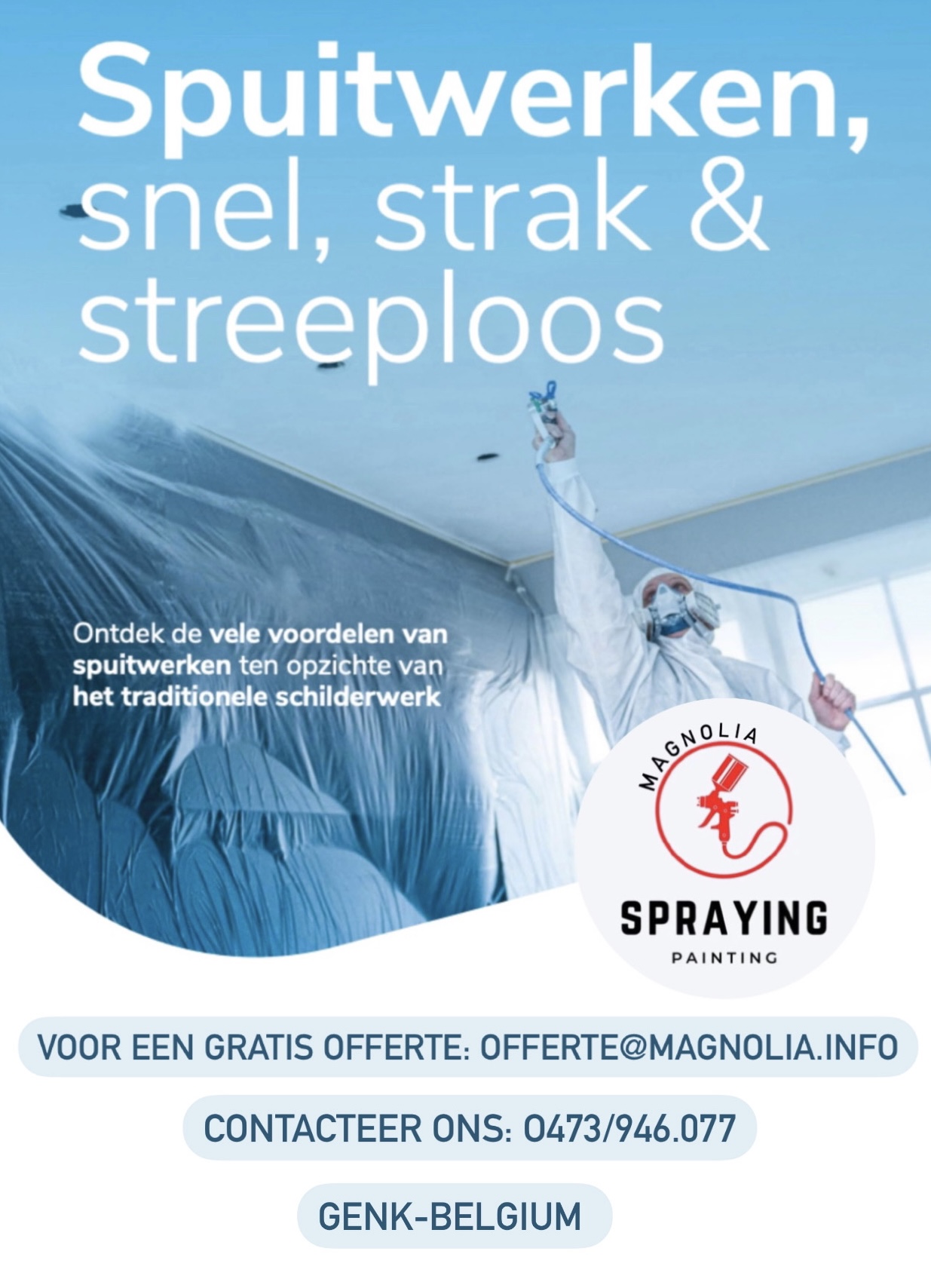 Magnolia spraying painting zorgt voor de complete afwerking en het onderhoud van woningen, appartementen en bedrijfspanden. Denk daarbij aan schilderwerken en spuitwerk. Spuiten is een snelle en efficiënte manier om uw wanden te voorzien van een nieuwe kleur. Ook leent deze manier van spuitwerken zich voor overspuiten in dezelfde kleur. Zo kunt u uw muur of plafond er weer als nieuw laten uitzien.. Hoe groter de ruimte (of hoe hoger het aantal te spuiten vierkante meters), des te voordeligere verfspuiten per vierkante meter zal zijn. Wij werken duurzaam en toekomstbestendig en adviseren de klant altijd om zo tot de beste keuze te komen.