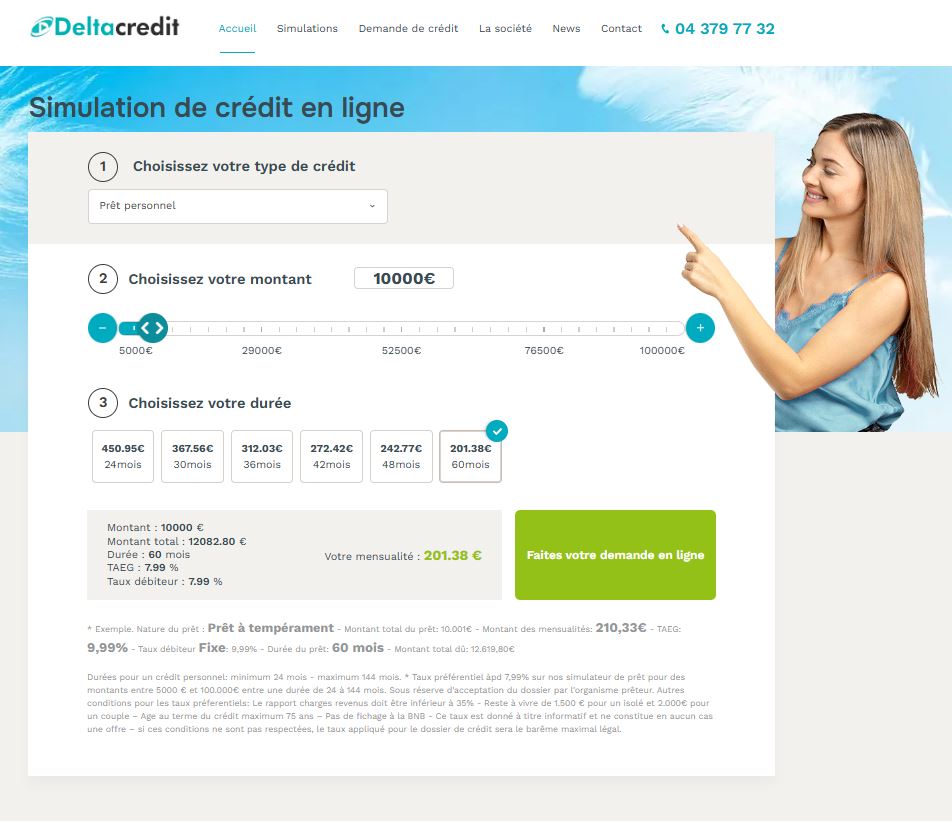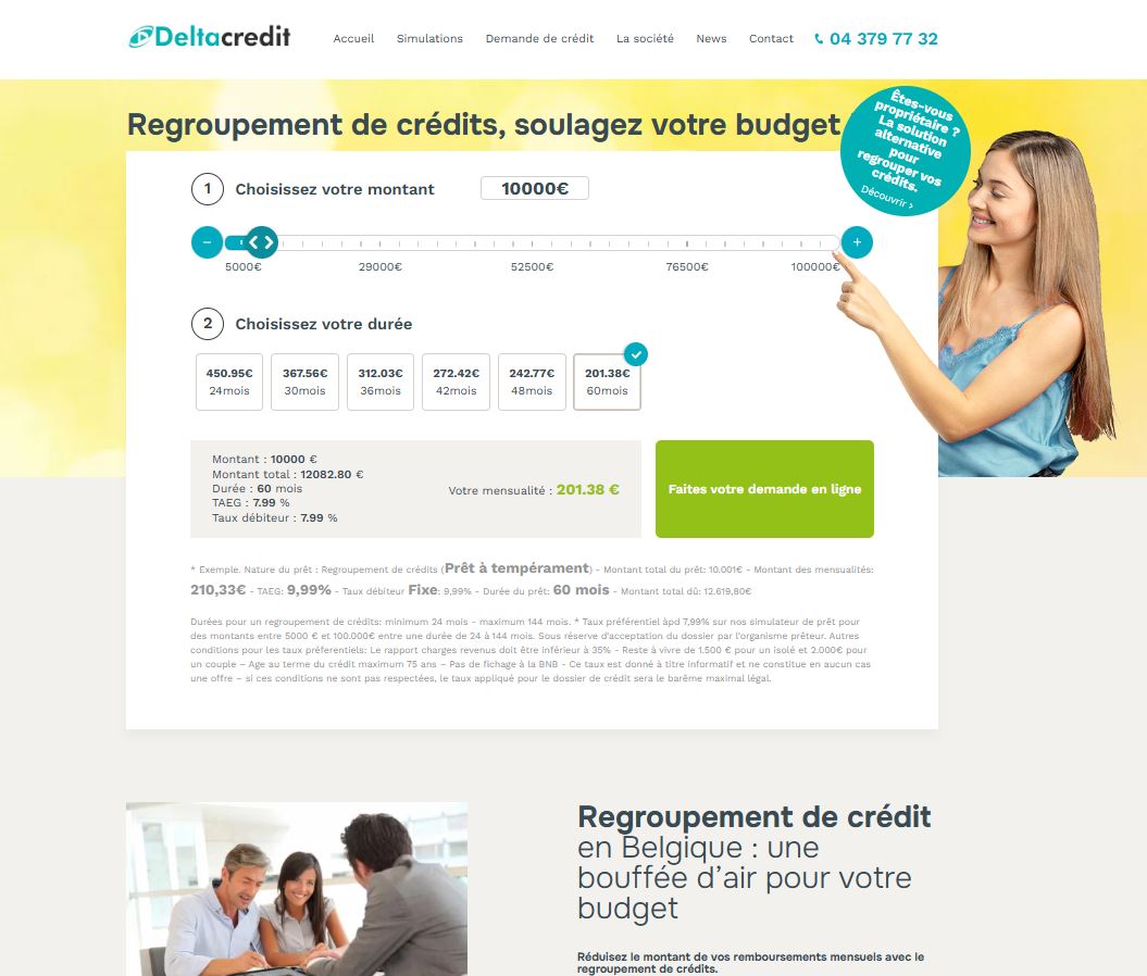 Deltacredit est un courtier indépendant actif partout en Belgique et au Luxembourg, spécialisé dans le regroupement de crédits, le prêt personnel et le prêt travaux. Grâce à son expertise reconnue et à ses partenariats avec plusieurs organismes financiers belges de référence, Deltacredit aide chaque emprunteur à trouver une solution adaptée à sa situation. Le regroupement de crédits permet de rassembler plusieurs emprunts en un seul afin de réduire les mensualités et de mieux gérer son budget. Le prêt personnel, lui, finance rapidement tous types de projets, tandis que le prêt travaux offre la possibilité de rénover, isoler ou embellir son habitation tout en maîtrisant ses coûts. Que vous soyez en Wallonie, à Bruxelles ou au Luxembourg.